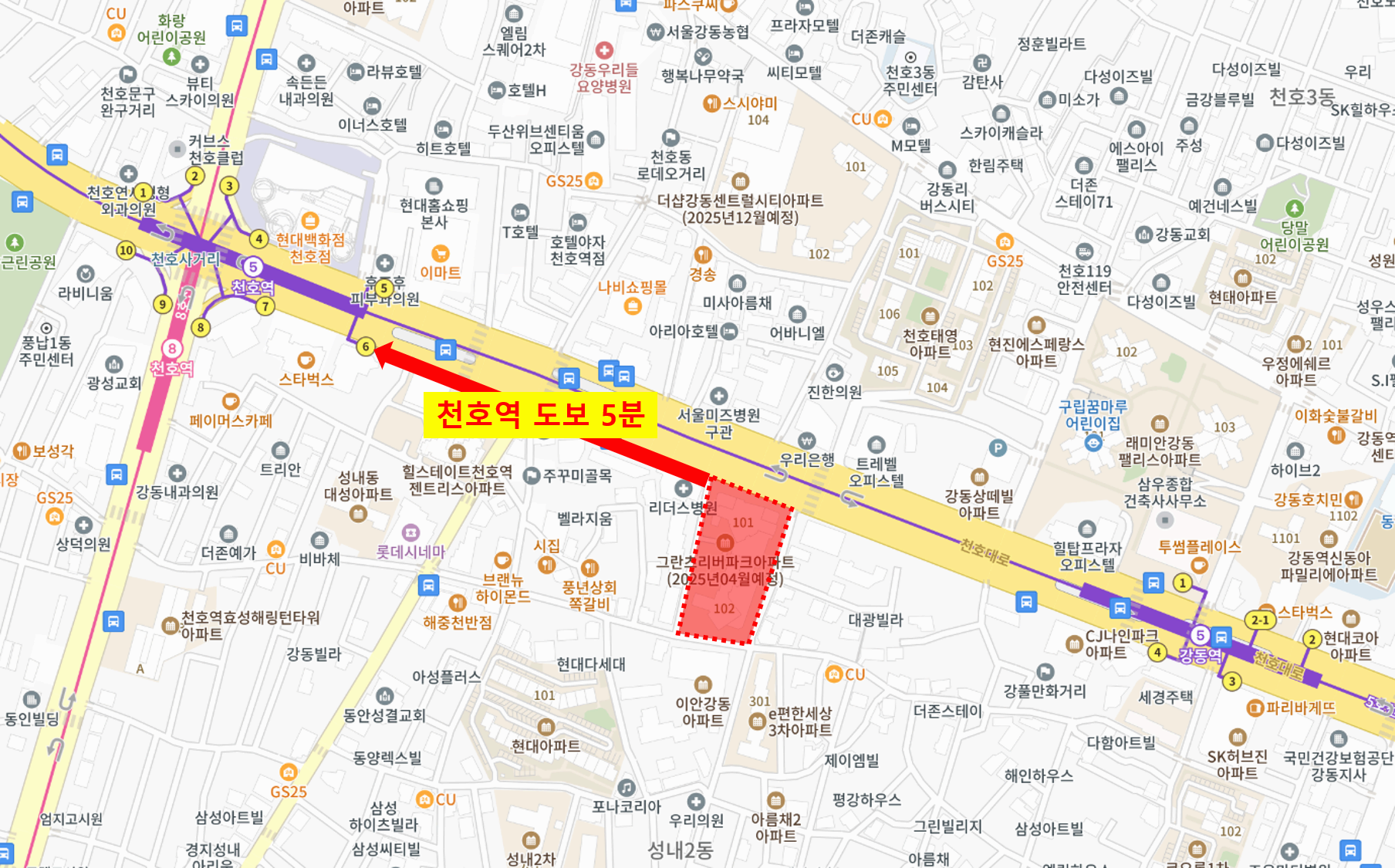 - 5호선 천호역, 8호선 강동역 더블 역세권 (도보 약 5분 거리)