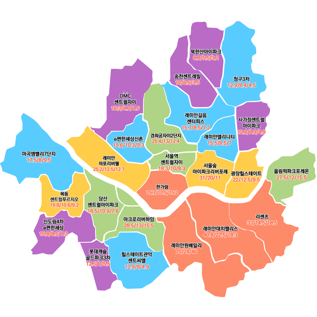 2. 용산/성동/마포/광진/강동 : 9~13억