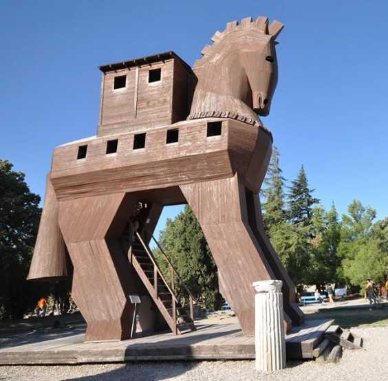호메로스는 트로이에 좋은 말들이 많다고 여러 차례 말한다. 그다지 뚜렷하지는 않지만 말의 뼈와 마구가 다량으로 발굴된 것은 호메로스의 트로이와 일치한다. 트로이와 관련해서 익숙한 말은 이른바 트로이의 목마다. 그리스 군은 커다란 목마를 만들어 마치 아테나에게 바치는 선물인 것처럼 트로이 성문 앞에 놓았다. 그러고는 헬레네를 포기한다는 듯한 기색을 보이며 물러갔다. 이제 승리했다고 믿은 트로이 군은 그 전리품을 성 안으로 가지고 들어갔다. 밤이 되자 목마의 배 안에 숨어 있던 그리스 병사들이 밖으로 나와 성문을 열고 성 밖에서 대기하던 동료들을 끌어들였다. 급습에 대비하지 못한 트로이 병사들은 죽음을 당했고 여자들은 사로잡혀 그리스로 끌려가 노예나 첩실이 되었다. 헬레네 역시 그리스로 압송되어 남편에게로 돌아왔다. 놀랍게도 호메로스가 묘사한 트로이 목마는 어느 정도 역사적 타당성이 있다. 근동에는 기원전 13세기경에 도시 성벽을 부수기 위해 쓰는 공성 망치를 말 모양으로 만들었다는 문헌 기록도 있고 그림도 전한다. 역사가 마이클 우드는 <일리아스>의 트로이 목마가 실은 그러한 '공성 기계'의 기억이 변형된 결과라고 추론한다.